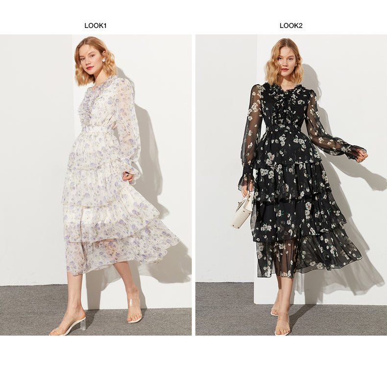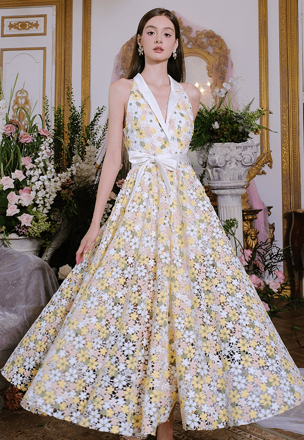 This banquet-length masterpiece is a wearable canvas. The Lily Dress has a ruffled silhouette and a square neckline. It feels like walking inside an oil painting. The experience is elegant, wistful, and undeniably refined.