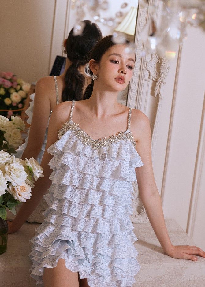 This tiered lace slip dress is a delicate work of art. With diamond trims and soft ruffles, “Tessa” brings a breath of fresh air with every step. It’s a refined nod to summer’s lighter, more graceful side.
