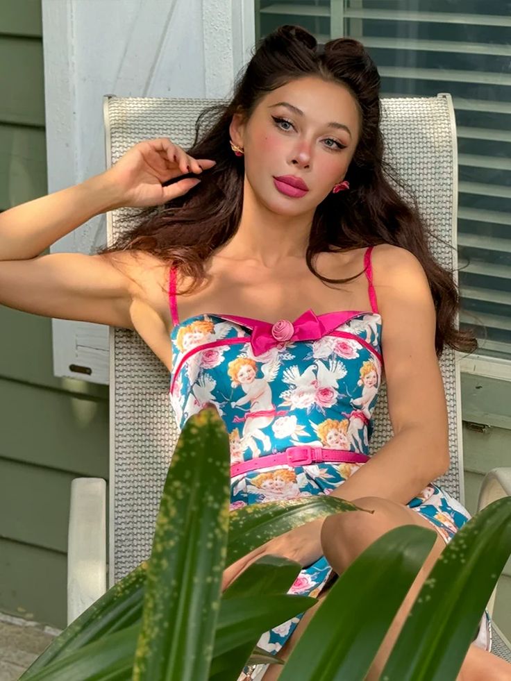 This slip dress is a true celebration of romance and vintage charm. It cinches at the waist and cascades into a sleek silhouette. The cupid angel pattern adds a playful twist to an otherwise figure-flattering, elegant piece.