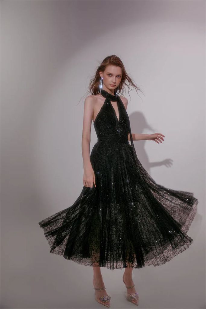 opt for sleek black pumps and a red lip. A polished chignon or high ponytail pairs perfectly with the halter neckline. Add a diamond or crystal stud for that subtle sparkle.