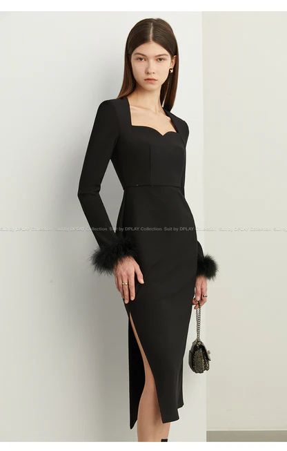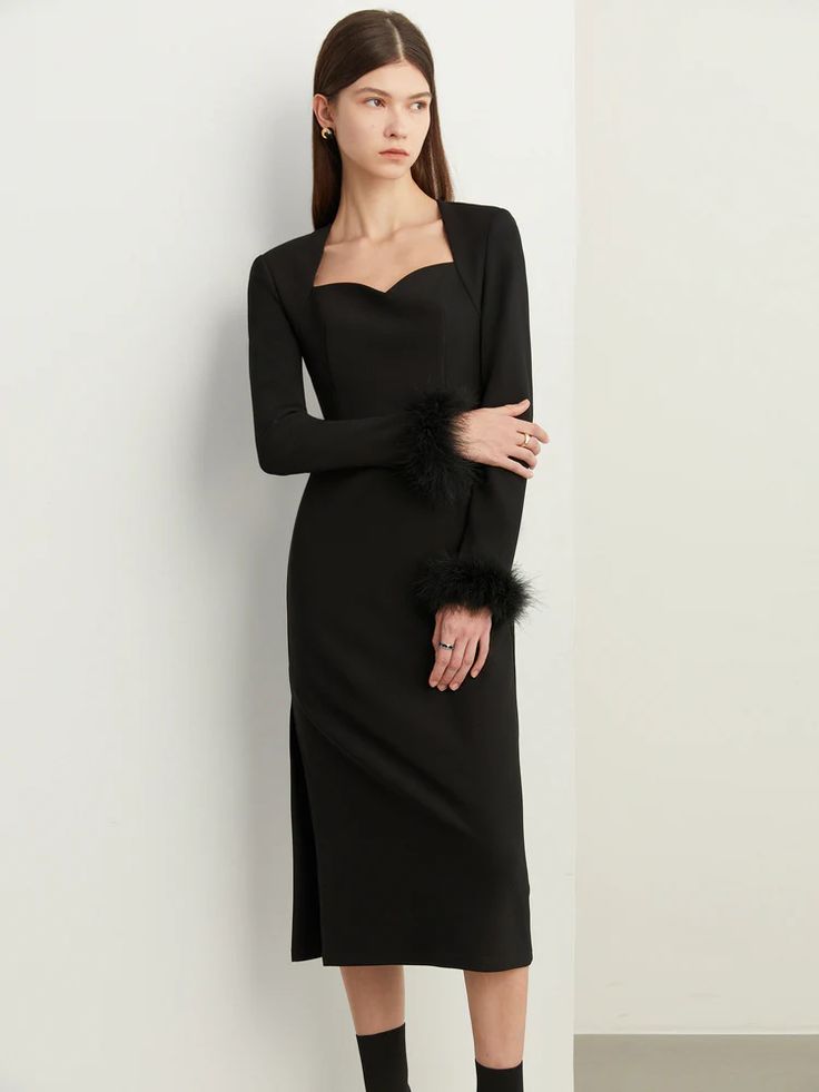Burlesque meets Wednesday Addams—your feather-paneled dress nails it.