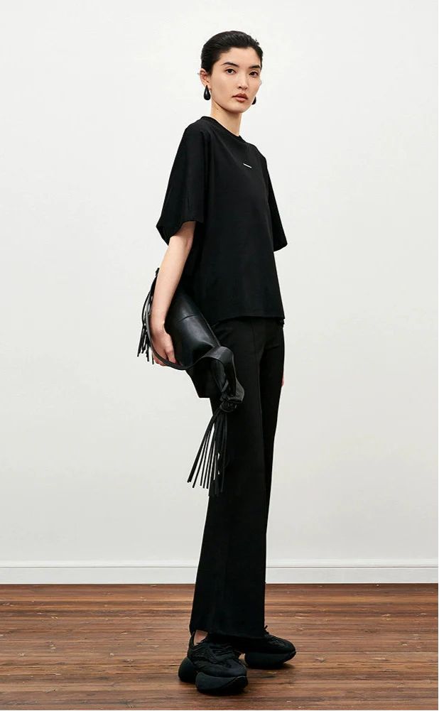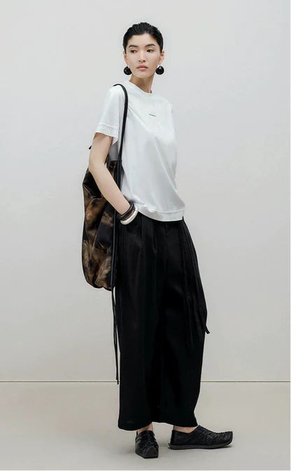 The Gyoumei Flared Pants: These are not your average trousers. The “simple slim” high-waisted design creates a powerful, elongated line, while the dramatic flare at the hem adds a touch of 70s-inspired glamour. In a timeless black, these pants are a versatile wardrobe cornerstone. They pair just as beautifully with a tucked-in white tee and sneakers as they do with a delicate silk camisole and heels.